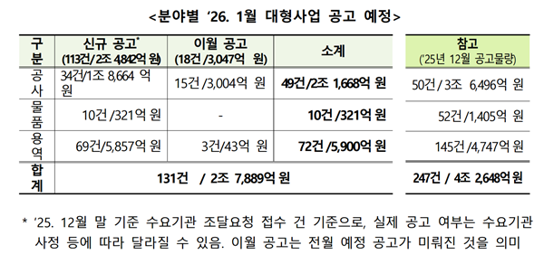 주요 신규 사업으로는 ▲시설공사는 가덕도신공항 접근도로 건설공사 등 광양(여천)항 묘도수도 직선화(1차), 광암정수장 고도증설 및 재정비공사 등 34건(1조8664억 원) ▲물품은 미터급 PBF 금속 3D프린터 1대, 임대주택 노후승강기 교체공사, 평택ㆍ당진항 안티드론 및 통합관제장비 구매ㆍ설치 등 10건(321억 원) ▲용역은 2026년도 재난안전통신망 A사업구역 운영 및 유지관리, 나이스 인프라 유지관리, 경찰차량 위탁관리 등 69건(5857억 원) 규모의 발주를 추진한다.