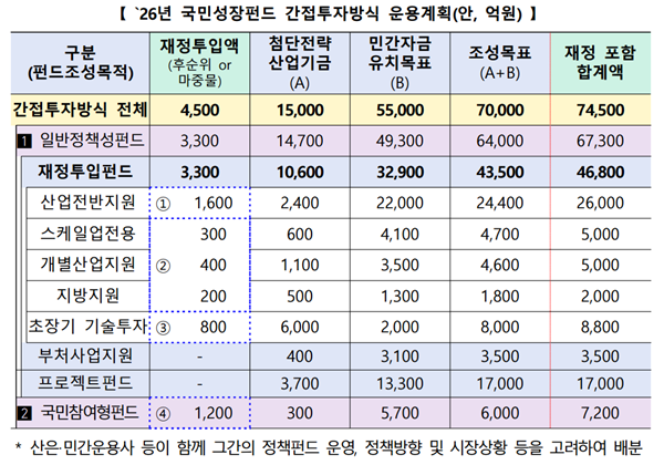 올해 국민성장펀드 목표액 30조 원 중 7조 원 이상은 간접투자 방식으로 모집해 첨단전략산업 분야에 공급한다는 계획이다.