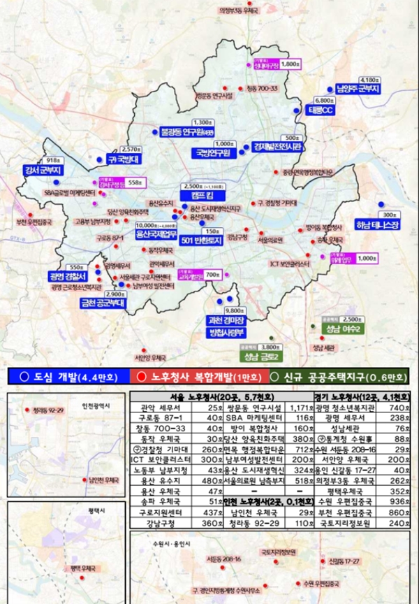 아울러 동대문구 옛 국방연구원ㆍ한국경제발전전시관(1500가구), 은평구 불광동 한국행정연구원 등 연구기관 4곳(1300가구)을 비롯해 광명경찰서(550가구), 강서구 군 부지(918가구), 금천구 독산동 공군부대(2900가구), 남양주 군부대(4180가구), 고양시 옛 국방대(2570가구) 등 수도권 역세권 소규모 부지나 간 사업이 장기간 지연된 부지도 공급 대상지에 포함됐다.