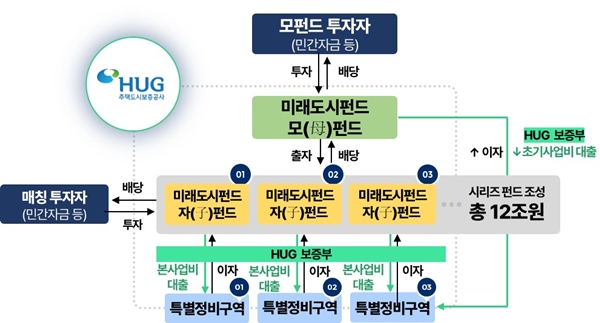 미래도시펀드는 대규모 재원이 소요되는 노후계획도시 정비사업의 초기 사업비, 공사비 등을 HUG 보증을 통해 낮은 금리로 안정적으로 조달하는 정책 펀드다.