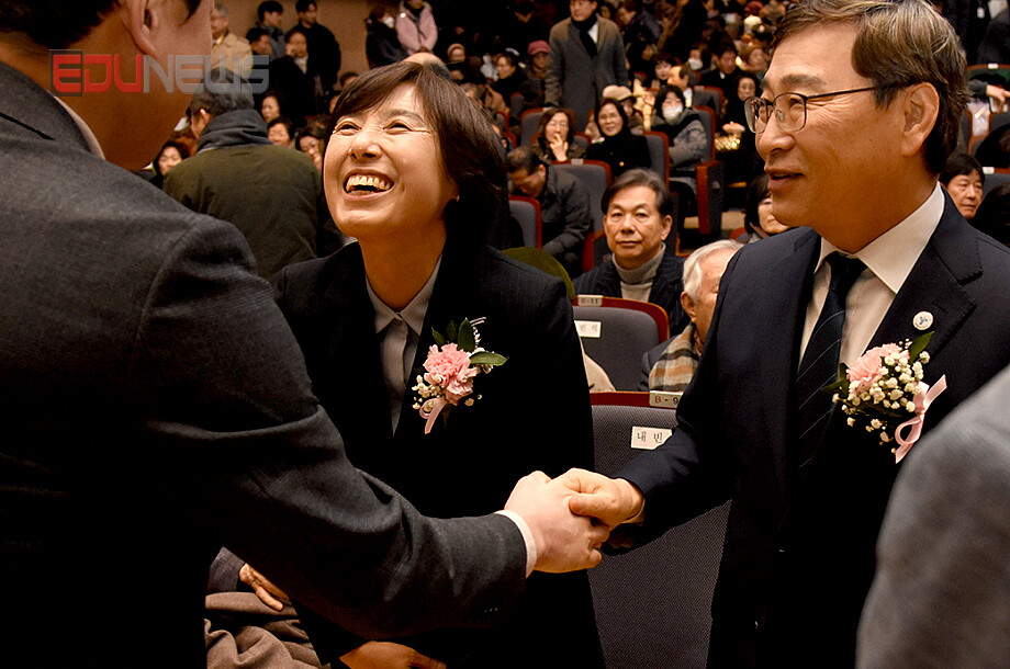 [에듀뉴스] 정근식 서울특별시교육감이 7일 오후 2시 서울교육대학교 대학본부 종합문화관 1층에서 자신의 저서 ‘정근식, 교육감의 길’ 출판기념회에서 강주호 한국교원단체총연합회회장과 인사를 나누고 있다.