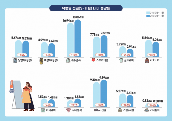 캐주얼복은 2025년 봄, 여름, 가을 시즌(2025년 3월~11월) 18조 8천6백억원의 소비 규모를 보여, 2024년 봄, 여름, 가을 시즌(2024년 3월~11월)에 16조9천4백억원에 비해 11.3%가 증가해 가장 큰 폭의 증가를 보였다.