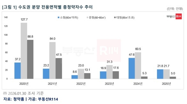 최근 부동산R114에 따르면 지난해 수도권 아파트 청약자 총 48만5271명 중 소형 아파트(전용면적 60㎡ 이하) 청약자수는 21만8047명으로 집계됐다.