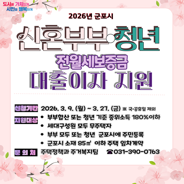 [아유경제=조명의 기자] 경기 군포시는 신혼부부와 청년들의 주거비 부담 경감을 위해 전월세 보증금 대출이자 지원사업 대상자를 모집한다고 이달 23일 밝혔다.