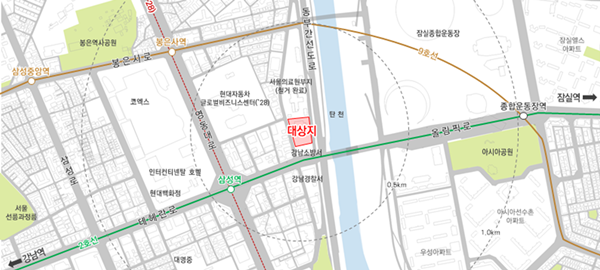 이 사업은 강남구 테헤란로113길 12(삼성동) 일원 1만988.5㎡를 대상으로 용도지역을 제3일반주거지역에서 일반상업지역으로 종상향해 용적률 800% 이하를 적용한 지하 7층~지상 38층 규모 업무시설, 근린생활시설, 특화전시시설 등을 조성하는 내용을 골자로 한다.