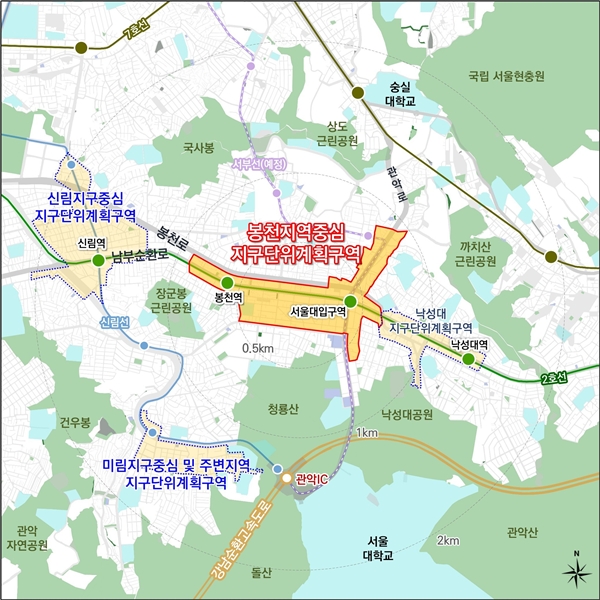 이번 지구단위계획 재정비는 2016년 이후 변화된 지역 여건을 고려하고, 저층 노후 건축물이 지역 중심 역세권 위상에 맞게 개발될 수 있는 기반을 마련하고자 추진됐다. 남부순환로 일대는 일자리 창출 복합 거점으로 조성하고 서울대입구역 일대는 업무ㆍ상업 복합거점으로 육성하는 한편, 관악로변 일대는 서부선(예정) 계획에 맞춰 전략적 업무 거점으로 재탄생한다.