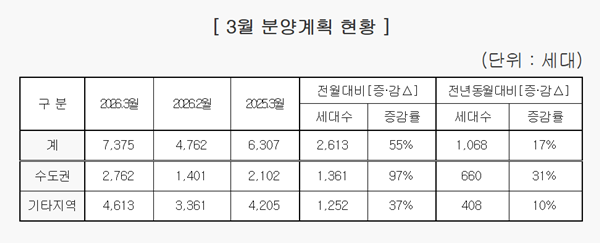 [아유경제_부동산] 중견주택업체, 올해 3월 7375가구 분양… 전년 동월비 17% 증가