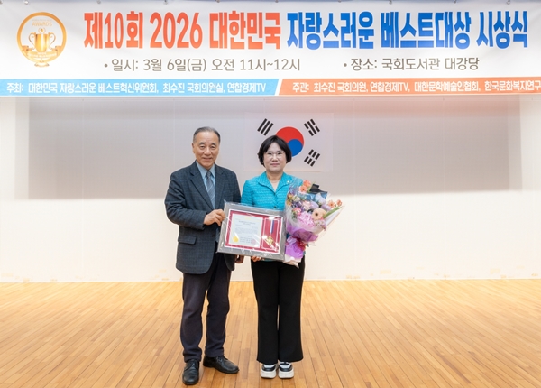 [아유경제=조현우 기자] 강남구의회 노애자 의원(국민의힘)은 지난 6일 국회도서관 대강당에서 열린 `제10회 2026 대한민국 자랑스러운 베스트대상` 시상식에서 의정 부문 대상의 영예를 안았다.