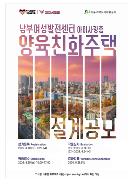 사업시행자인 서울주택도시개발공사(SH)는 양육친화주택 아이사랑홈 2호의 설계공모를 실시한다. 설계공모는 시 설계공모 누리집에서 오는 10일 공고되며 이달 20일까지 참가 등록을 받는다.