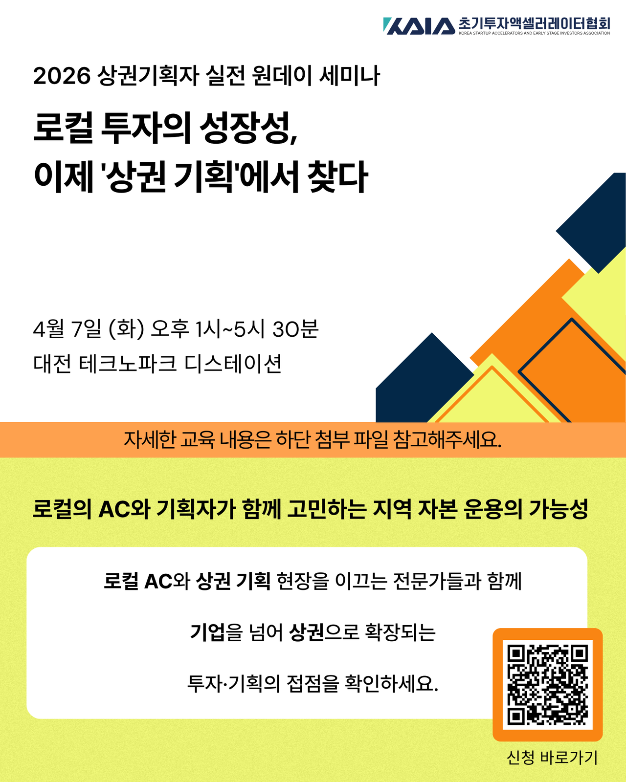 오는 4월 7일 대전테크노파크 디스테이션에서 상권 기획자의 핵심 역량과 비전을 다루는 ‘2026 상권 기획자 실전 원데이 세미나’를 개최한다. /제공=초기투자액셀러레이터협회