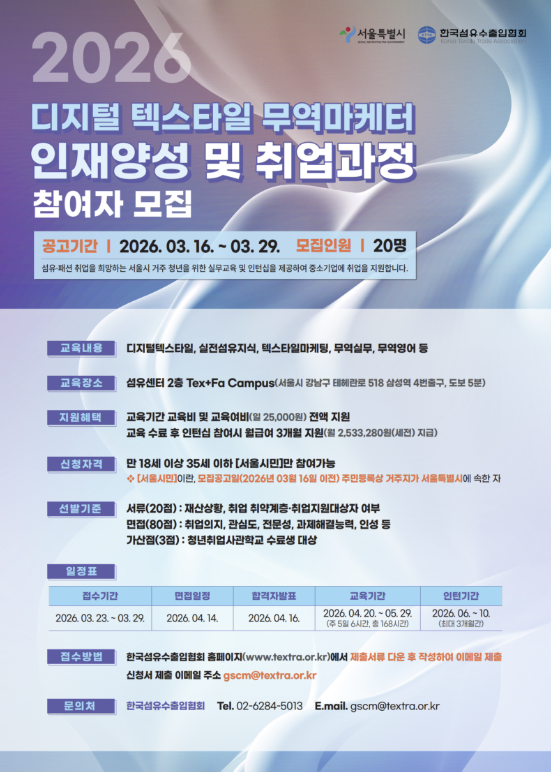 선발된 참여자는 디지털 텍스타일 무역 및 마케팅 관련 직무 교육을 먼저 이수한 뒤 교육 수료자를 대상으로 기업 인턴 매칭이 진행된다. 협회는 기업과의 협력을 통해 현장에서 요구되는 실무 역량을 중심으로 교육을 운영하고, 수료자의 취업 연계를 적극 지원할 계획이다.