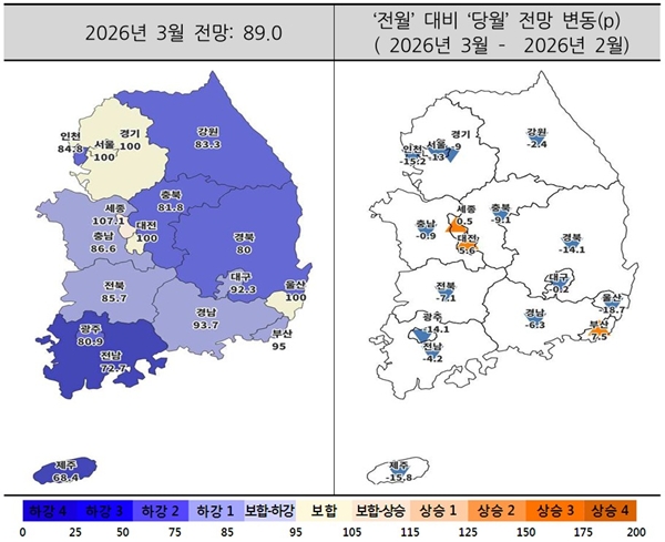 수도권은 전월(107.3)보다 12.4p 하락한 94.9로 전망됐다. 인천 15.2p(100→84.8), 서울 13p(113→100), 경기 9p(109→100) 순으로 내렸다.