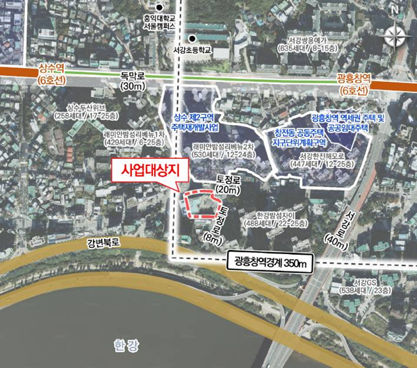 대상지는 지하철 6호선 광흥창역에 인접한 역세권으로, 서강대교와 강변북로를 통해 여의도와 도심으로 빠르게 이동할 수 있는 지역이다. 한강변에 위치해 한강 조망과 개방감을 두루 갖춰 정주 여건이 우수한 데다, 인근 주거 단지와 교육 시설도 밀집해 있어 주거 선호도가 높은 편이다.