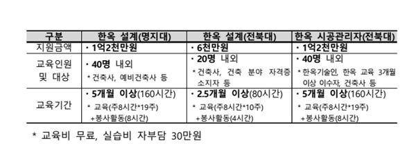 한옥 설계 과정은 명지대와 전북대, 한옥 시공 관리자 과정은 전북대가 맡는다. 수업은 두 대학에서 오는 5월부터 매주 토요일 진행된다. 우수 수료생에게는 국토부 장관상을 수여하며, 과정별로 올 10월 이후 수료생 작품 전시와 수료생 우수작품집 발간도 추진할 예정이다.
