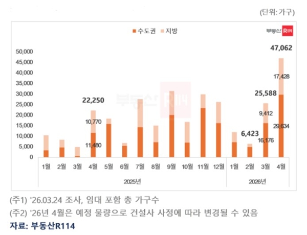 부동산R114 관계자는 "4월은 전통적인 분양 성수기인 데다 3월에 예정된 물량 일부가 이월됐고, 6월 지방선거 전 분양일정을 소화하려는 단지가 늘며 물량이 집중됐다"라고 설명했다.
