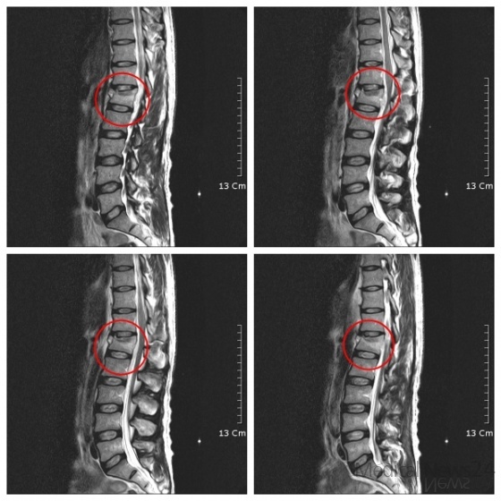 < MRI영상에서 보이는 제1요추 방출성 압박골절상태의 우즈베키스탄 환자의 척추영상>