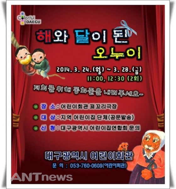 공연 일정은 3월 24일부터 28일까지 매일 11:00, 12:30, 2회에 걸쳐 진행되며, 이번 작품은 우리나라 전래극인 ‘해와 달이 된 오누이’이다.