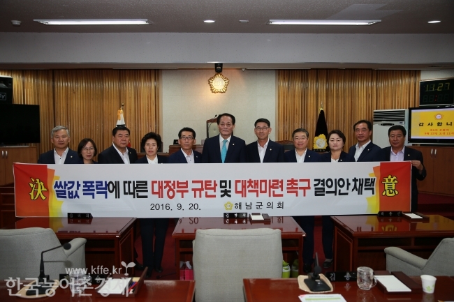 해남군의회(의장 김주환)는 9월 20일 제263회 임시회 제1차 본회의를 열어「쌀값 폭락에 따른 대정부 규탄 및 대책마련 촉구결의안」을 채택하였다.