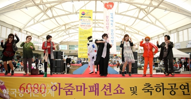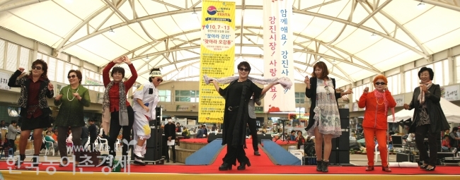 지난 13일 전남 강진군 오감통 강진시장에 패션쇼 런어웨이가 설치됐다.전통시장을 이용하는 주 고객인 주부와 상인들이 한마음이 되어 그동안 감춰두었던 옷맵시를 맘껏 뽐냈다.강진군은 코리아 세일 페스타와 연계해 관광객들에게 볼거리를 제공하고 상인들의 화합의 자리를 마련하기 위해 6080 아줌마 패션쇼를 기획했다.