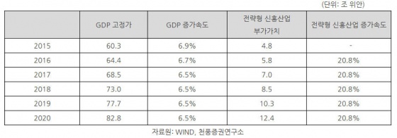 규획은 2020년까지 전략형 신흥산업의 부가가치가 국내 총생산 차지 비율의 15%까지 증가할 것이라고 밝혔으며, 이는 만약 미래 GDP가 평균 약 6.5%의 증가속도라고 가정했을 때, 전략형 신흥산업의 미래 5년의 복합증가속도는 약 20.8%가 된다는 것을 의미한다.