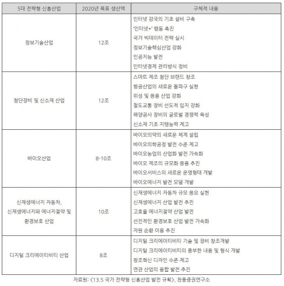 또한, 2020년까지 전략형 신흥산업의 부가가치가 국내 총생산의 15%의 비율을 차지하는 목표를 세웠다.