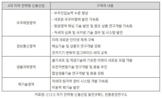 그중 둘째는 신흥 산업의 탄생을 지속적으로 촉진시키고, 우주·해양, 정보통신, 생물과학, 핵기술 등의 핵심영역에서 돌파구를 찾는 것임.