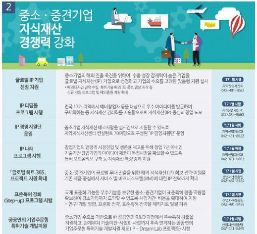 ㅇ (글로벌 IP기업 선정지원) 수출 성장 잠재력이 높은 중소기업을 글로벌 지식재산 기업으로 선정하고, 기업의 수요를 고려한 맞춤형 지원 실시 (‘17. 1. 시행)