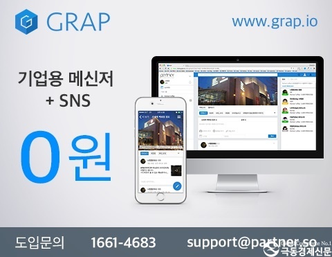 그랩은 신세계 그룹, 육군훈련소, S마켓 등에서 사용 중인 서비스로 업무에 필요한 메신저, 소셜네트워크서비스, 조직도, 화상회의 등을 하나로 통합한 제공하고 있다. PC와 모바일 연동이 가능하며 1GB 이상의 대용량 문서도 저장 기한 걱정 없이 안전하게 보관할 수 있다. 업무 주제별로 뉴스피드 그룹을 만들면 실시간으로 업무 흐름을 파악하기 쉬워진다.