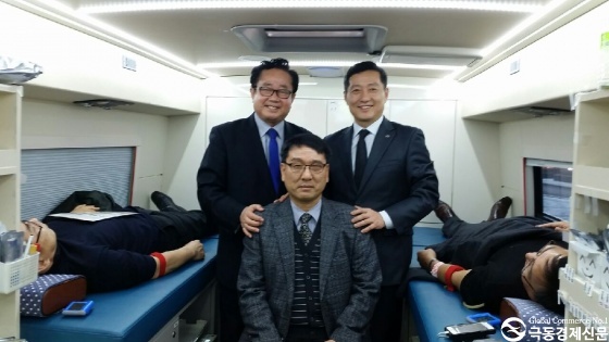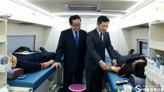 [사진설명 : 헌혈을 격려하는 허승욱정무부지사(오른쪽)와 장원석상임대표(왼쪽)]