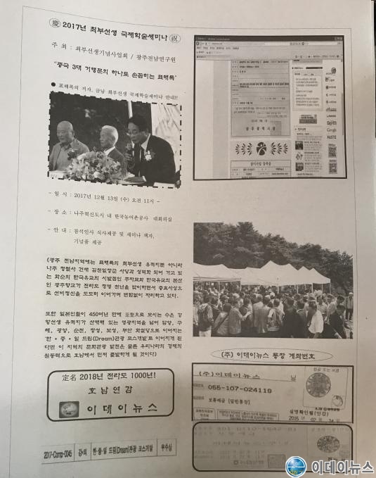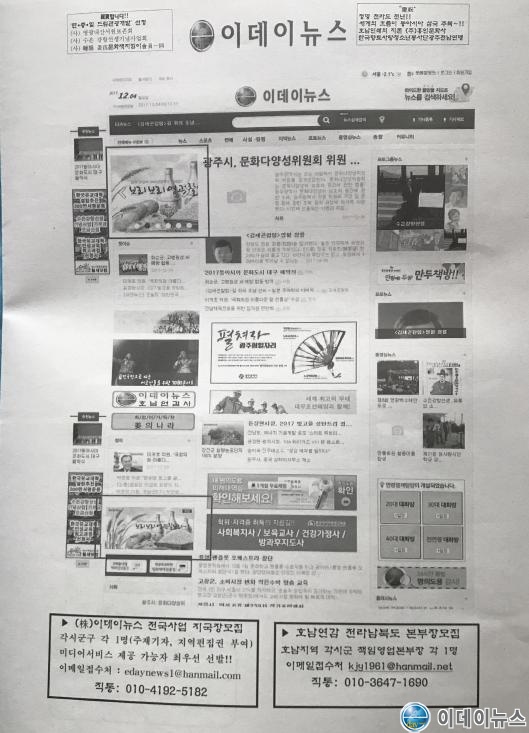 상호명:(주) 이데이뉴스 | 제호: 이데뉴스닷컴 | 사업자번호 : 409-86-29149 주소: 광주광역시 북구 북동 4-9번지 2층 / 북구 금재로75번길 21. 2층(북동) 등록번호: 광주 아-00144 | 등록일: 2005년 10월 4일 | 발행인/편집인: 강대의(010-4192-5182) 청소년보호책임자 : 강대의 (010-4192-5182) | 제보 및 각종문의 : (062)673-0419(代) | FAX : (062)456-5181 Copyright(c) 2016 :::이데이뉴스닷컴::: All rights reserved.