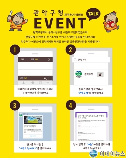 또한, 관악구는 카카오톡 플러스친구 오픈 기념으로 ‘카카오톡 플러스 친구 추가 이벤트’도 진행하며 관악구청 카카오톡 플러스친구를 추가한 후, 기본정보를 입력하면 자동으로 응모된다.