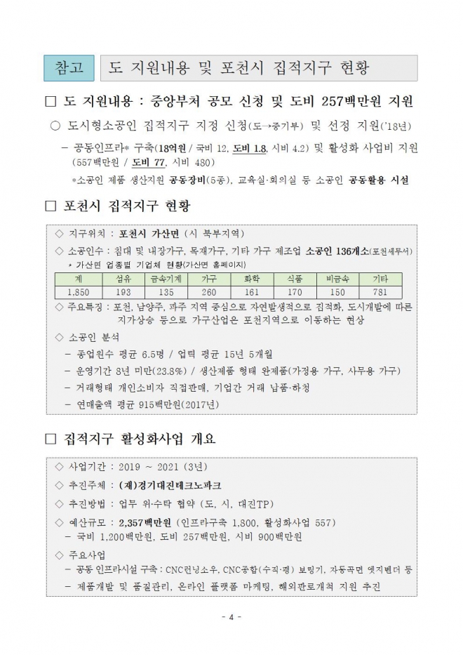 포천시 가산면 일대는 2018년 7월 중소벤처기업부로부터 ‘가구공예 도시형소공인 집적지구’로 선정됨에 따라 국비 12억 원, 도비 2억 원, 시비 4억 원 등 총 18억 원을 지원받아 가구지원센터를 개소하게 됐다.