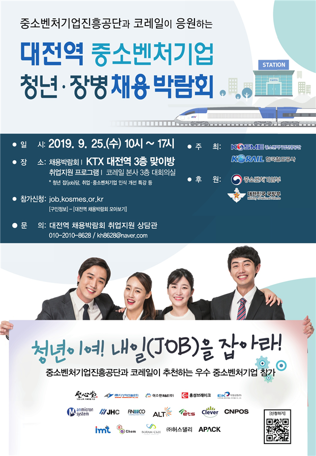 중소벤처기업진흥공단(이사장 이상직)은 2019년 9월 25일(수) 대전역 3층 맞이방에서 청년장병·구직자 대상 중소벤처기업 채용박람회를 개최한다고 밝혔다.