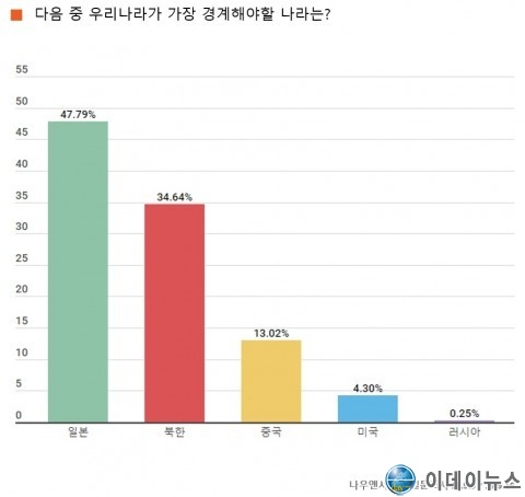 ‘우리나라가 가장 경계해야할 나라는?’에 대하여 질문한 결과 ‘일본(47.79%)’이 가장 많은 응답을 차지하였고, 그 뒤를 이어 ‘북한(36.64%)’, ‘중국(13.02%)’ 순으로 나타났다.