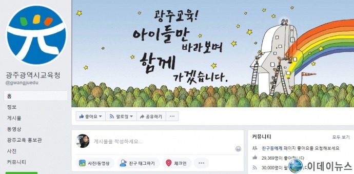 시교육청은 지난 10월4일 ‘광주광역시교육청 페이스북 페이지’ 팔로워 수가 정확히 30,000명에 도달했다고 7일 밝혔다. 7일 오전 10시 기준 팔로워 수는 3만 131명이다.