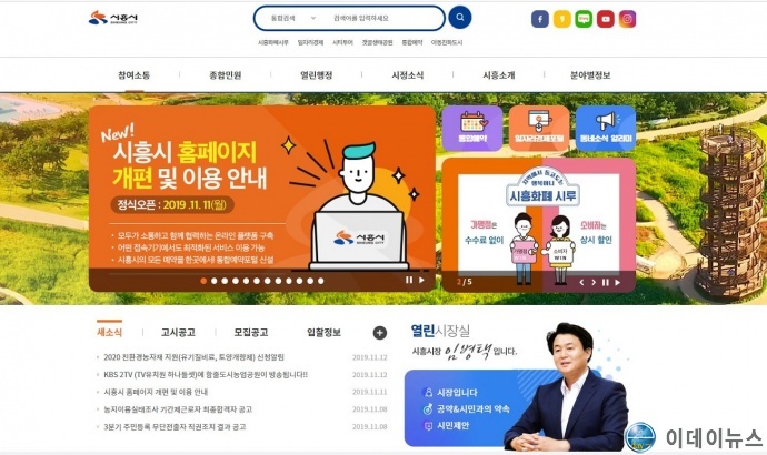 시흥시(시장 임병택)는 시민과 함께하는 시정구현을 위해 반응형웹 홈페이지 통합구축 사업을 완료하고 정식으로 서비스를 개시했다. 이번 시 홈페이지 전면개편은 시민의 정보 접근성 향상을 목표로 맞춤형화면, 동네소식알리미, 시민제안 등 새로운 기능을 다수 신설해 주목받고 있다.