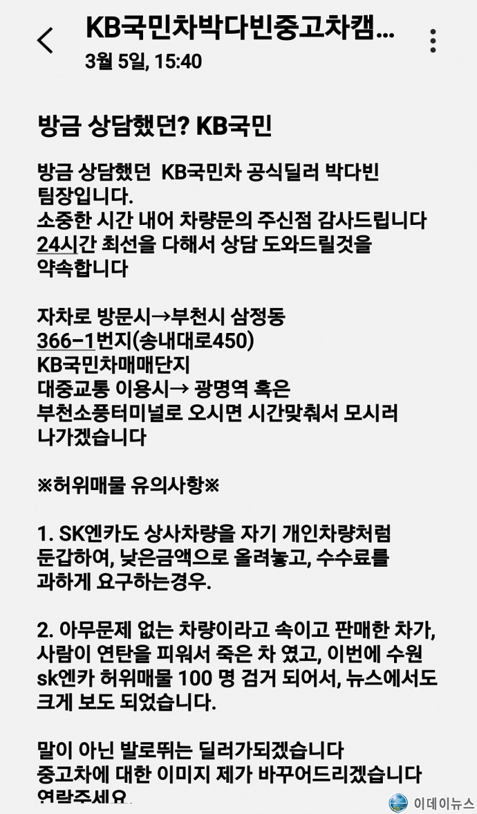 친절하게 상담을 하는 박다빈딜러(이미 홈페이지에 공개가 된 딜러이름으로 당연히 공개함)와 이후로도 문자와 또 다른 전화로 상담을 이어갔다. 주말에도 관계없이 근무를 한다고 알려와 이번주 토요일에 중고차 상담을 하기로 하고 7일 부천으로 향한다.