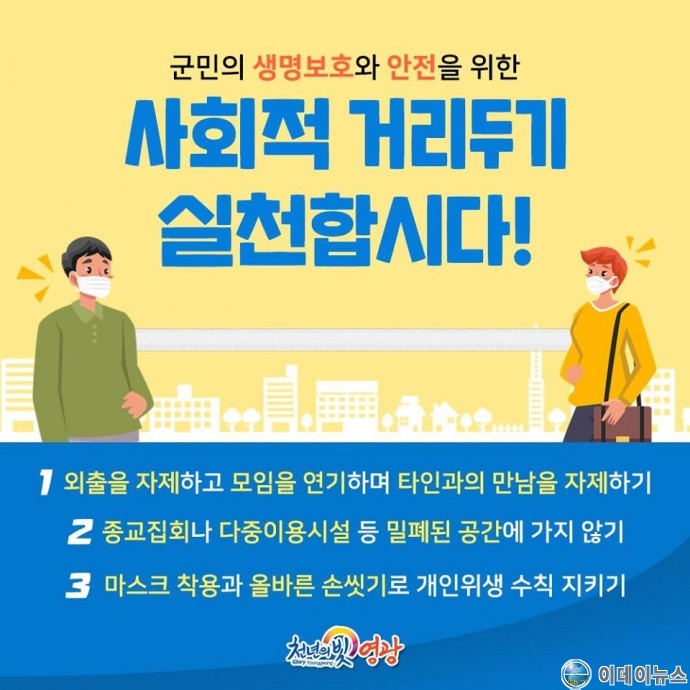 이에 따라 영광군은 전광판, 현수막, 홍보 포스터, SNS 등을 통해 사회적 거리두기 운동을 전 군민에게 대대적으로 홍보하고 있으며 집단감염 위험시설을 점검하고 운영 중단을 강력히 권고했다.