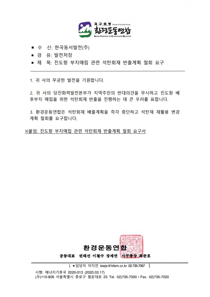 환경운동연합이 지난 3월 17일, 한국동서발전(주) 앞으로 공문을 보내 ‘진도항 부지매립 관련 석탄회재 반출계획 철회’를 요구했다.