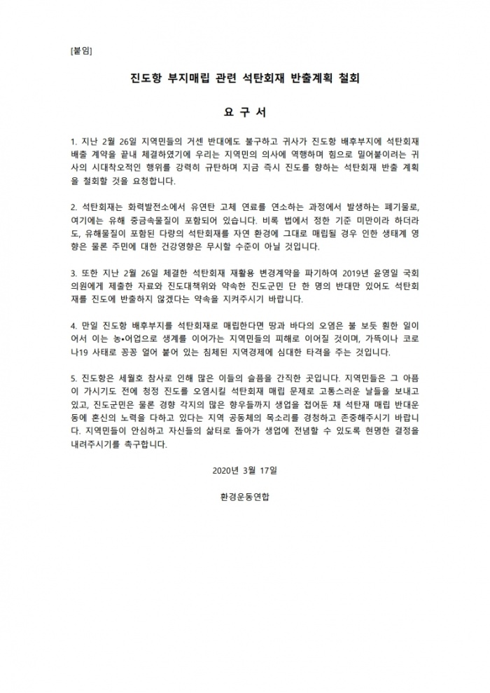 환경운동연합은 공문에서 “또한 지난 2월 26일 체결한 석탄회재 재활용 변경계약을 파기하여 2019년 윤영일 국회의원에게 제출한 자료와 진도대책위와 약속한 진도군민 단 한 명의 반대만 있어도 석탄회재를 진도에 반출하지 않겠다는 약속을 지켜주시기 바란다”며 “만일 진도항 배후부지를 석탄회재로 매립한다면 땅과 바다의 오염은 불 보듯 훤한 일이어서 이는 농•어업으로 생계를 이어가는 지역민들의 피해로 이어질 것이며, 가뜩이나 코로나19 사태로 꽁꽁 얼어 붙어 있는 침체된 지역경제에 심대한 타격을 주는 것”이라고 밝혔다.