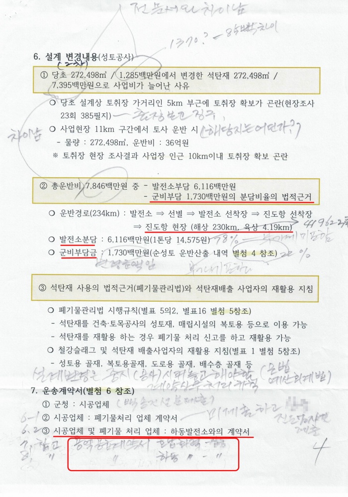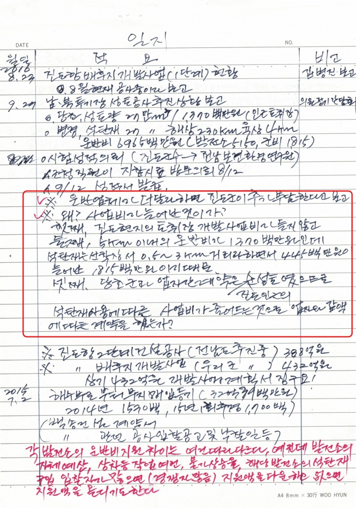 ‘일지’라고 쓰여진 이 기록에서 박영상 의원이 석탄재 반입 사업에 대해 강한 의혹을 가지고 있었다는 사실을 알 수 있다. 박 의원은 “운반업체가 (운반비를) 더 달라고 하면 진도군이 추가 부담해야 한다”는 관계 공무원의 보고에 의문을 나타냈다. 또 석탄재로 하면서 사업비가 줄지 않고 오히려 늘어난 데 대해서도 중요표시(※)를 해두었다.