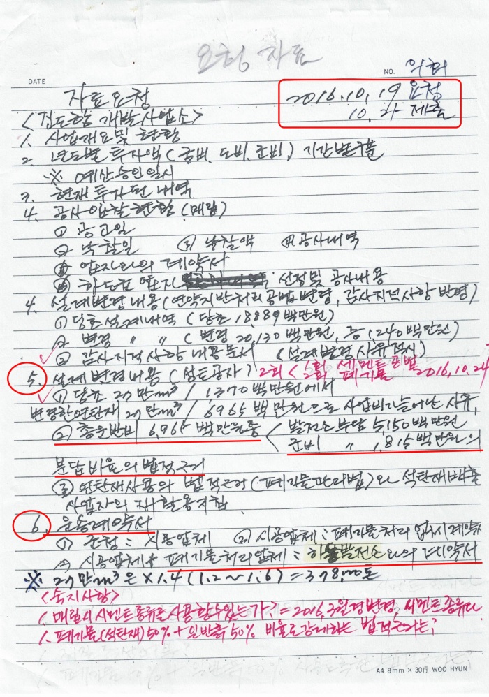 박영상 의원은 보고회가 끝난 이후에도 의문이 풀리지 않았는지 별도 의정 활동 노트에 자필로 의문점을 기록해 놓았다.