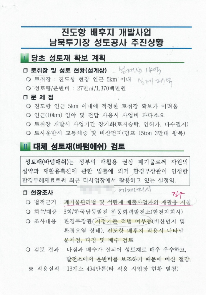 진도군은 “이런 문제를 해결하는 대안으로 석탄재(바텀애쉬)를 검토했는데, 다짐과 배수가 잘 되어 성토재로서 매우 우수하고, 발전소에서 운반비를 보조하기 때문에 예산이 절감된다”고 부연했다.
