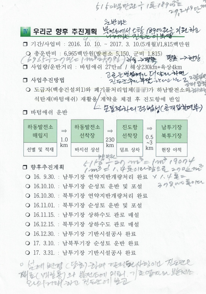 박영상 의원은 9월 27일, 진도군이 제출한 보고서를 보며 여러 가지 메모를 남겨놓았다. 그 메모를 통해 재구성해 보면, 진도군 관계 공무원은 “2016년 10월 10일부터 2017년 3월 10일까지 5개월 동안 석탄재를 반입하고, 사업비는 1,815백만원이 필요하다”고 설명했다. “총운반비는 6,965백만원인데 발전소에서 팽목까지 오는 데 5,150백만원을 지원하고, 진도군에서 하역·처리하는 데 1,815백만원이 든다”고 덧붙였다.
