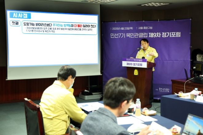 발표자로 나선 이성 구청장은 관내 코리아빌딩 콜센터와 만민중앙교회 감염 발생 사례를 중심으로 구체적인 조치사항과 결과를 설명했다.