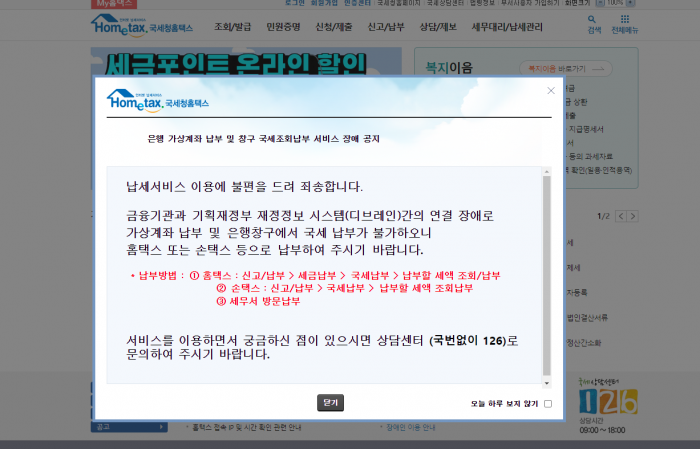 현재 국내 은행을 통한 국세 납부가 안되고 있으며 가상계좌를 통한 납부도 오류가 지속되고 있다.