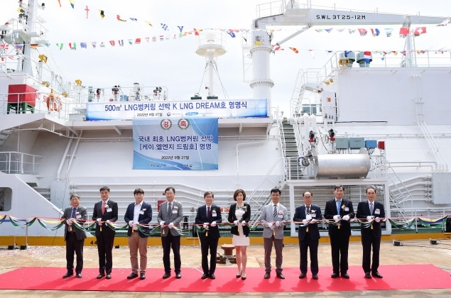 선박해양플랜트연구소(소장 김부기, 이하 KRISO)가 27일 국내 최초로 개발한 500㎥급 LNG벙커링선박 ‘K LNG Dream호’의 명명식을 경남 고성 EK중공업에서 개최했다고 밝혔다.
