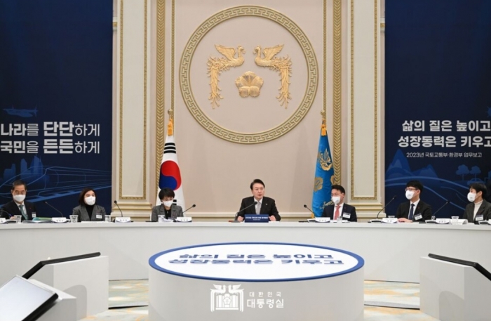 윤석열 대통령은 1. 3. (화) 청와대 영빈관에서 국토교통부와 환경부로부터 2023년 국토교통·환경 정책 방향을 보고 받았다.