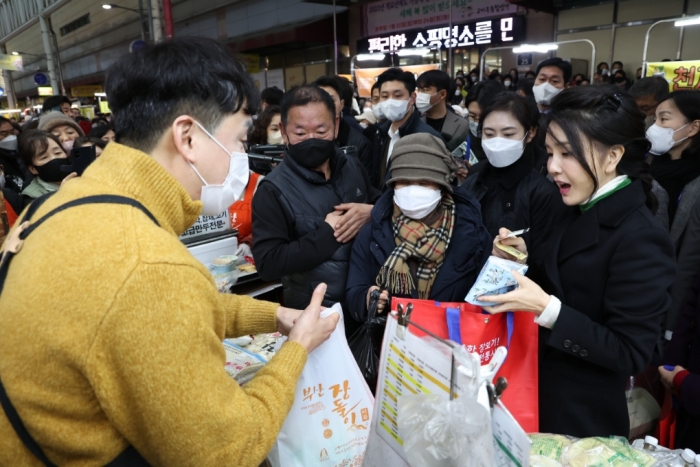 김 여사는 봉사활동에 이어 대구 서문시장을 방문했습니다. 시장에서 설 명절 준비를 위한 여러 가지 물품과 식자재, 현장에서 먹을 수 있는 다양한 음식을 구매하면서 최근 어려움을 겪고 있는 소상공인과 자영업자들을 격려했다.