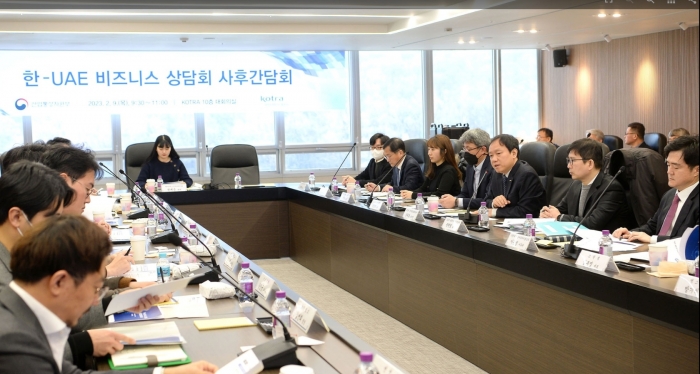 KOTRA(사장 유정열)가 9일 염곡동 본사에서 ‘한-UAE 비즈니스 상담회 참가기업 사후간담회’를 개최했다. 이번 사후간담회는 1월 UAE 국빈 방문 시 아부다비에서 열린 ‘한-UAE 비즈니스 상담회’ 후속지원의 일환으로 상담회에 참가했던 주요 기업들을 초청해 성과 및 애로사항을 청취하고, 향후 지원방안을 협의하는 자리로 마련됐다.